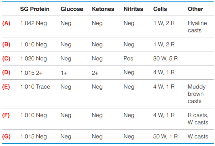 If a urinalysis is performed, which of the following would most likely be seen?