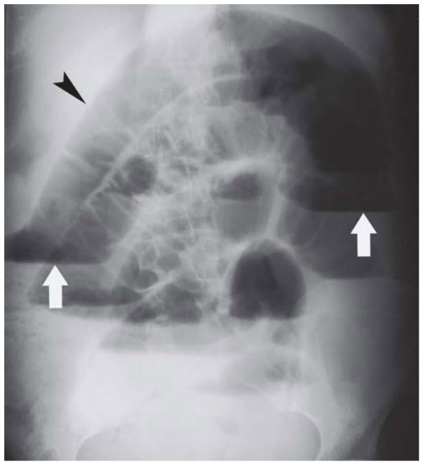 A 66-year-old woman with a history of multiple abdominal surgeries presents with nausea, vomiting, and abdominal pain. Abdominal x-ray is shown in Figure below.