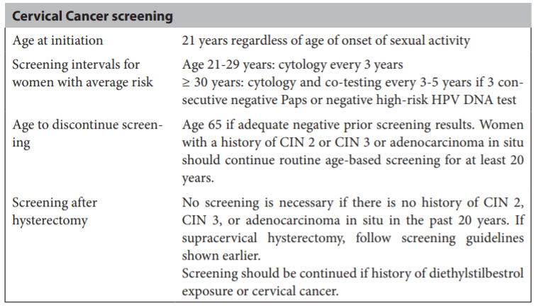Routine screening for sexually transmitted disease is not warranted for all women; however, all sexually active women younger than 25 years of age should be routinely screened for gonorrhea and chlamydia, and older women with risk factors such as new or multiple partners, sex work, or concurrent STD should also be screened. There is no routine screening recommended for hepatitis B virus or herpes simplex virus. Hepatitis C screening should occur in those with risk factors such as intravenous drug use, dialysis, partner with hepatitis C, multiple partners, and received blood products prior to 1990. Syphilis screening should also occur in those with risk factors such as sex work, confinement in an adult correction facility or men having sex with men. Screening for cervical cancer should begin at the age of 21 years.