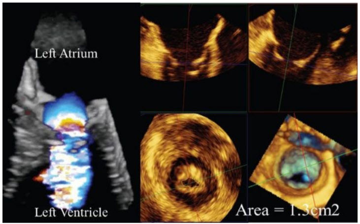 Proximal flow convergence radius (PFCR) using color 3D across the mitral valve indicates an orifice area of 1.2 cm2 . Resting PA pressures are 35 mmHg. Splittability score is 5. LV size and function are normal.