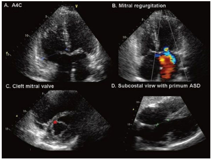 Primum ASD and its associated features. Note that the septal leaflet of the tricuspid valve is on the same plane as the mitral valve (A). Normally the septal leaflet of the tricuspid leaflet is apically displaced compared with the mitral valve. Mitral regurgitation frequently coexists with primum (B). (C) Short-axis views of the mitral valve show a “cleft” pointing toward the septum (*). (D) The cleft is more accurately characterized as a commissure between the superior and inferior bridging leaflets of the common AV canal. Additional echocardiographic features of AVSD (not demonstrated here) include elongation of the LV outflow tract (gooseneck deformity) ± LVOT obstruction. A4C, apical 4 chamber; ASD, atrial septal defect.
