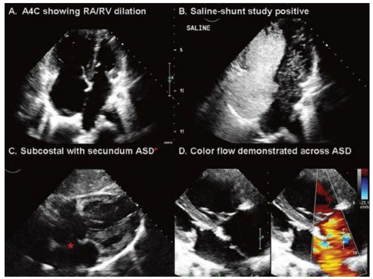The findings of RA and RV dilatation in the apical four-chamber (A4C) view (A) and significant right-to-left shunting of agitated saline (B) are highly suggestive of an ASD ± anomalous pulmonary venous return. A secundum ASD is confirmed as a defect in the midportion of the interatrial septum, best seen in subcostal scan plane (C) and with color flow Doppler (D). ASD, atrial septal defect; RA, right atrium; RV, right ventricle.