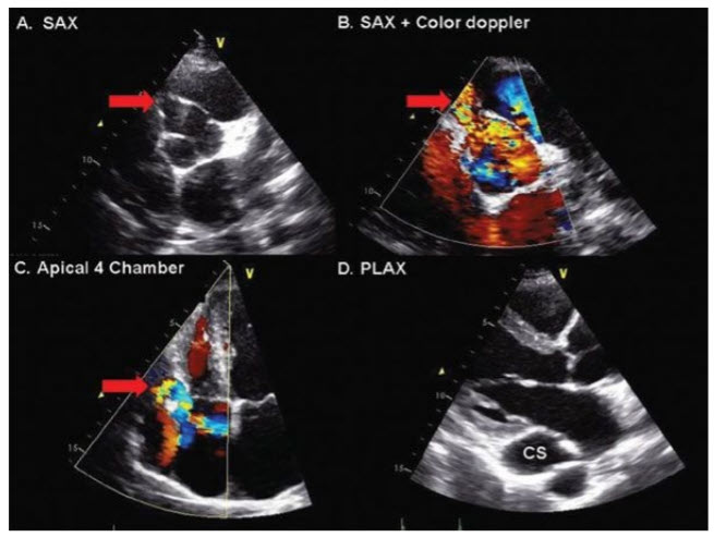The right coronary artery fistula (red arrow) is seen in transthoracic short- axis (SAX) views arising from the right coronary cusp of the aortic valve (A) confirmed with color flow Doppler (B). In this case, the right coronary fistula drained into the right atrium (C) via a dilated coronary sinus (D). PLAX, parasternal long axis.