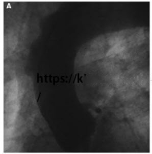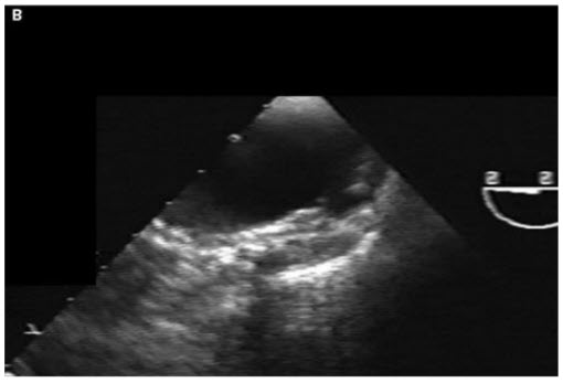 Contrast dye collects slowly in this region. The patient’s chest pain is intensifying. A TEE is also performed (Fig. below).