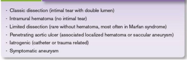A 74-year-old man presents to the ER with upper back pain ongoing for 3 hours. The pain is described as sharp and severe occurring at rest. He has no associated symptoms of shortness of breath, chest pain, or presyncope. His past medical history is notable for a coronary artery bypass graft (CABG) 2 years previously, HTN, and ongoing tobacco use. At the time of his CABG, he was noted to have a 4.4-cm ascending aortic aneurysm that was not repaired. His medications include aspirin, an angiotensin-converting enzyme inhibitor, and a β-blocker.