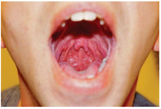 Loeys-Dietz syndrome. Loeys-Dietz is an autosomal dominant genetic aortic aneurysm syndrome. It predominantly involves children and young adults with risk of rapid progression to aneurysms, arterial tortuosity, and dissection. It is associated with a bifid uvula (shown in figure in question), cleft palate, and hypertelorism. Other clinical findings similar to Marfan syndrome may be present. Cogan syndrome is a rare large-vessel vasculitis that involves the aorta and is associated with vestibular and ocular abnormalities including uveitis and keratitis. Ormond disease is an inflammatory form of aortitis associated with retroperitoneal fibrosis. Behçet disease is an instead of a arteritis associated with oral and genital ulcers and skin lesions. Image of the oropharynx of a young boy with Loeys-Dietz syndrome showing a bifid uvula (see figure in question).