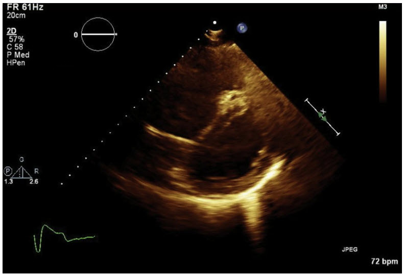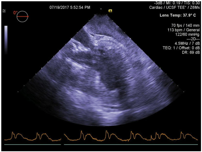 An 85-year-old woman underwent a transapical transcatheter aortic valve replacement (TAVR) for severe symptomatic aortic stenosis. After an uneventful procedure, she is brought to the ICU intubated and sedated. In the 30 minutes after arrival to the ICU she develops progressive tachycardia and hypotension, which prompts the placement of a TEE probe. The mid-esophageal 4-chamber view is shown in the figure below: