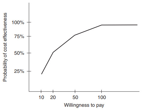 The net benefit approach forces decision makers to directly consider the issue of valuing additional patient outcomes. The INB can be computed with various λ s and analyzed using multiple regression techniques. How sensitive the results are to the assumed λ value can be gauged using a cost effectiveness acceptability curve (CEAC). The CEAC shows the probability that a new treatment is cost-effective for different values for λ. So in the given question, if λ is £150, the probability of it being cost-effective is >90%. But if the λ is £10, the probability is less than 25%. At the same time, the probability of cost-effectiveness is also >90% if λ was £100. So, it would be sensible for the decision maker to pay £100 for every depression-free day, rather than a £150.
