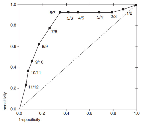E. From the graph, we can see that the more the ROC curve deviates from the dotted line and tends toward the upper left-hand corner, the better the sensitivity and specificity of the test. Hence it is generally considered that the cut-off point that’s closest to this corner is the one that minimizes the overall number of errors (‘the best trade off’); in this case, it is 6/7. Since the scale in our question is a screening test for depression, we would want it to be more sensitive rather than specific. As we can see from the figure, a cut-off score of 11/12 would give excellent specificity, but very poor sensitivity, thus increasing the false negative rates.