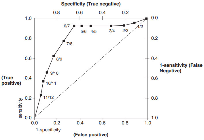 A. The test in question is a 12-item scale that has a potential score ranging from 1 to 12. The sensitivity and specificity of each cut-off score (in this case, there will be 11 possible cut-off scores, as shown in the figure) is calculated with reference to the gold standard used to diagnose depression (in this case, DSM-IV). These pairs of values are plotted, with (1 – specificity) on the x-axis and the sensitivity on the y-axis, yielding the curve in the figure in question. Note that the true positive rate is synonymous with the term sensitivity, the true negative rate is the same as specificity, and the false positive rate means the same as (1 – specificity); they’re simply alternative terms for the same parameters. For simplicity, the graph can be depicted as below