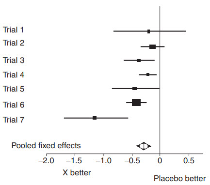 A meta-analysis of seven RCTs that compared a new antidepressant X with placebo was conducted. Effect size analysis for the change in HAMD scores are shown in the graph above. With respect to the graph below, answer Questions 97–99.