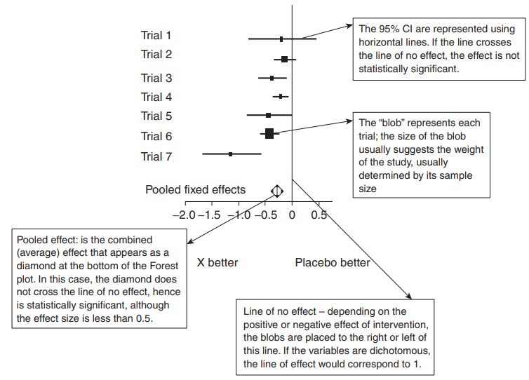 E. Meta-analysis are usually displayed in graphical form using Forest plots, which present the findings for all studies plus (usually) the combined results. This allows the reader to visualize how much uncertainty there is around the results. The graph in question, modified below, presents a Forest plot, sometimes called a ‘blobbogram’ identifying its basic components.