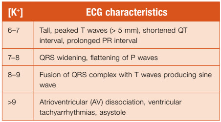 Answer: B: Clinical manifestations of hyperkalaemia result from changes in the transmembrane potential. Cardiac cells are particularly vulnerable and more sensitive in acute changes in potassium levels. ECG changes are characteristic (see Table below), however, an insensitive method in evaluating the degree of hyperkalaemia. In chronic hyperkalaemia, ECG changes tend to occur at higher potassium levels.