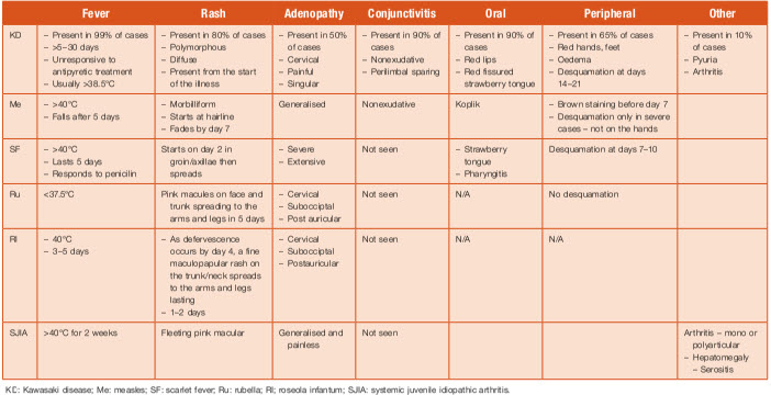 A 2-year-old girl presents with fever, sore throat and coryzal illness for 5 days. She developed a maculopapular pink rash on day 2 of her illness as well as ‘pink eyes’. She appears miserable on examination with a temperature of 40°C, bilateral conjunctivitis with exudate, phayngeal injection and dry, fissured lips. She has painful cervical adenopathy and a profuse pink morbilliform rash on her trunk.