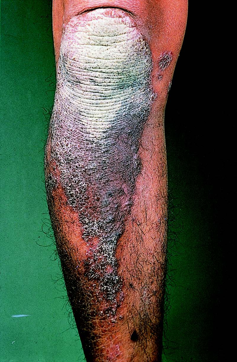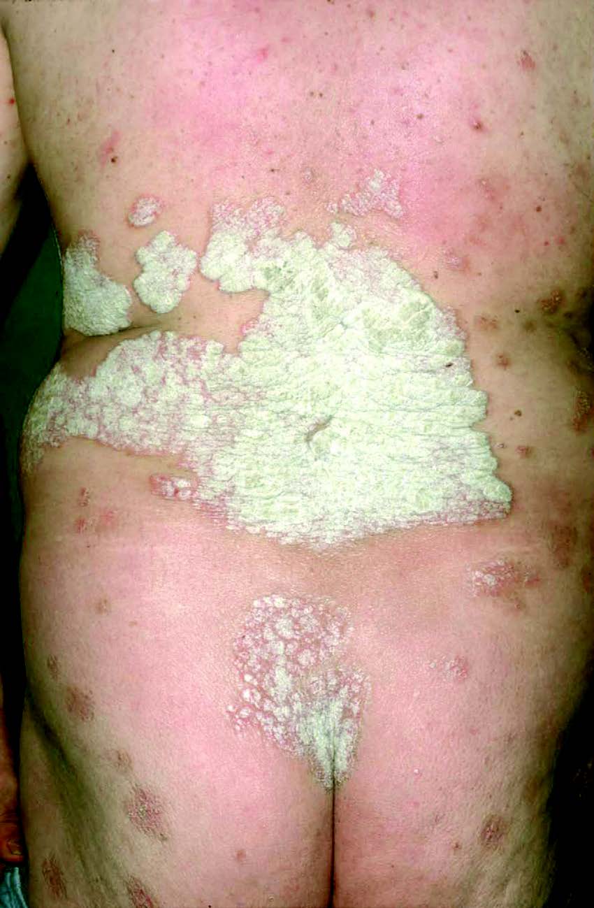 Most plaques of psoriasis are surmounted by silvery white scaling, which varies considerably in thickness.