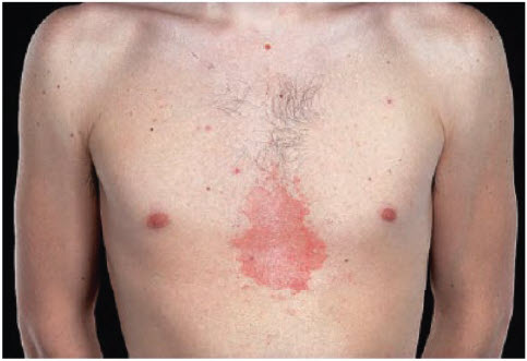 pityriasis rosea with herald patch on the right of the chest.