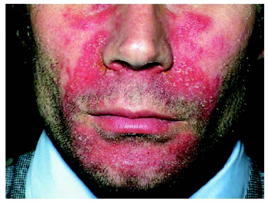 Severe facial seborrhoeic dermatitis with prominent involvement of the naso-labial grooves.