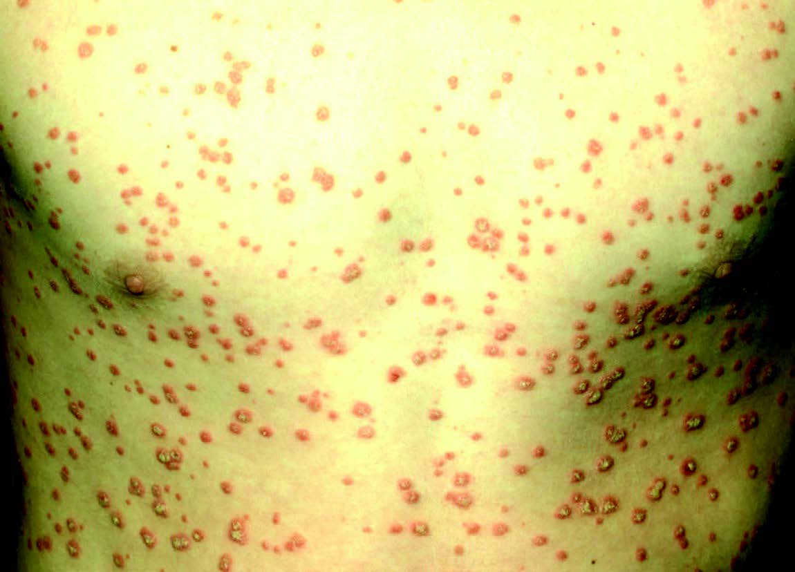 Extensive lesions of guttate psoriasis in a young man.