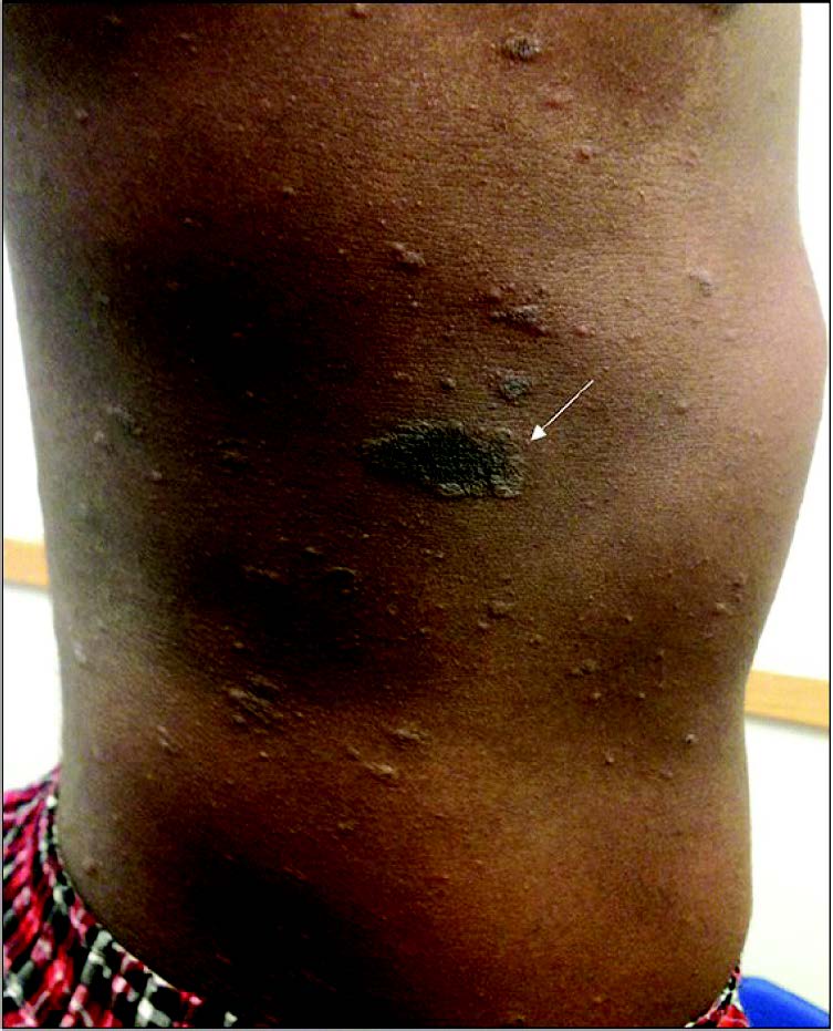 Second recurrence of pityriasis rosea – herald patch indicated by the white arrow.