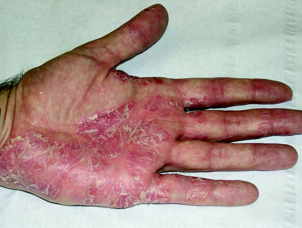 On the palms, psoriasis may present as typical scaly plaques.
