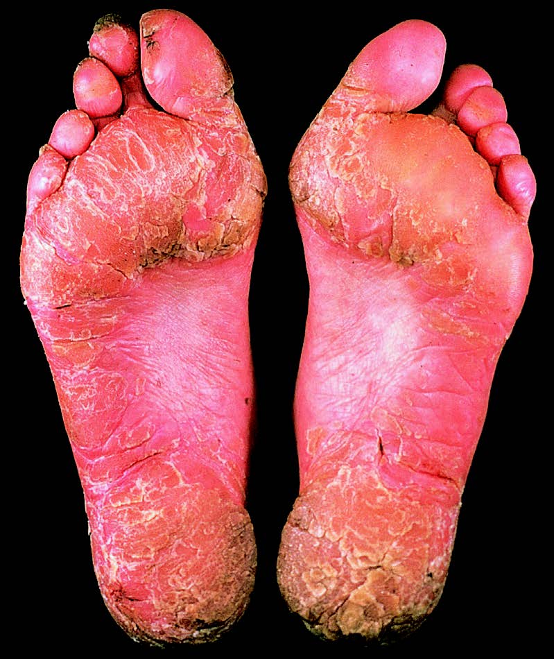 On the soles, psoriasis may present as typical scaly plaques.