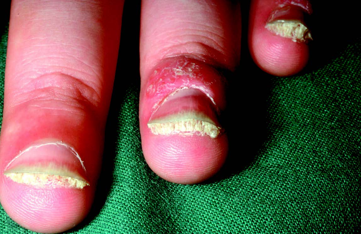 Marked psoriatic subungual hyperkeratosis.