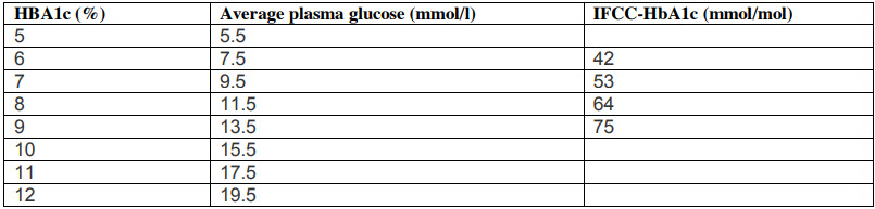 The relationship between HbA1c and average blood glucose is complex but has been studied by the Diabetes Control and Complications Trial (DCCT). A new internationally standardized method for reporting HbA1c has been developed by the International Federation of Clinical Chemistry (IFCC).