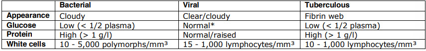 *Mumps is unusual in being associated with a low glucose level in a proportion of cases. A low glucose may also be seen in herpes encephalitis.