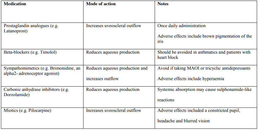 The majority of patients with primary open-angle glaucoma are managed with eye drops. These aim to lower intra-ocular pressure which in turn has been shown to prevent progressive loss of visual field.