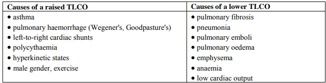 Correct Answer C: Where alveolar haemorrhage occurs the TLCO tends to increase due to the enhanced uptake of carbon monoxide by intra-alveolar haemoglobin.