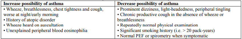 The 2008 British Thoracic Society guidelinesmarked a subtle change in the approach to diagnosing asthma. This approach is supported in the updated 2011 guidelines. It suggests dividing patients into a high, intermediate and low probability of having asthma based on the presence or absence of typical symptoms. A list can be found in the external link but include typical symptoms such as wheeze, nocturnal cough etc.