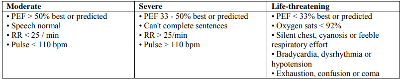 Patients with acute severe asthma are stratified into moderate, severe or life-threatening: