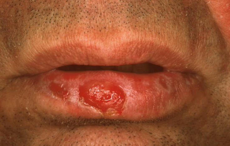 A 62-year-old man who is a cigar and pipe smoker develops a circular lesion on the lower lip. See picture: