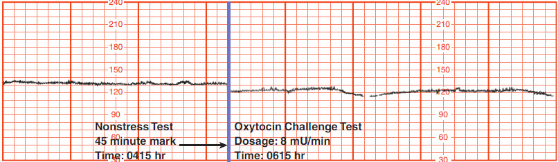 A 24-year-old white gravida 2 para 1 at 39 weeks gestation who is currently not in active labor is seen in the labor and delivery suite for evaluation of decreased fetal movement. Her blood pressure is 120/74 mmHg and she has a temperature of 36.80 C (98.4 F). A representative portion of her nonstress test is shown here.