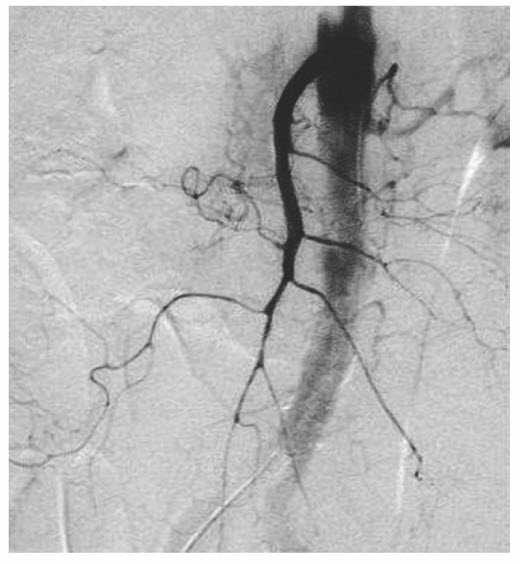 The treatment of nonocclusive mesenteric ischemia is primarily pharmacologic with selective mesenteric arterial catheterization followed by infusion of vasodilatory agents, such as tolazoline or papaverine. Once the diagnosis is made on the mesenteric arteriography (Fig. below), intra-arterial papaverine is given at a dose of 30 to 60 mg/h. This must be coupled with the cessation of other vasoconstricting agents.