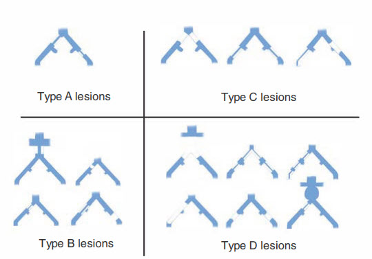 The most commonly used classification system of iliac lesions has been set forth by the TransAtlantic Inter-Society Consensus (TASC) group with recommended treatment options. This lesion classification categorizes the extent of atherosclerosis and has suggested a therapeutic approach based on this classification (Table and Fig. below). According to this consensus document, endovascular therapy is the treatment of choice for type A lesions, and surgery is the treatment of choice for type D lesions. Endovascular treatment is the preferred treatment for type B lesions, and surgery is the preferred treatment for good-risk patients with type C lesions. In comparison to the 2000 TASC document, the commission has not only made allowances for treatment of more extensive lesions, but also takes into account the continuing evolution of endovascular technology and the skills of individual interventionalists when stating the patient's comorbidities, fully informed patient preference, and the local operator's long-term success rates must be considered when making treatment decisions for type B and type C lesions.