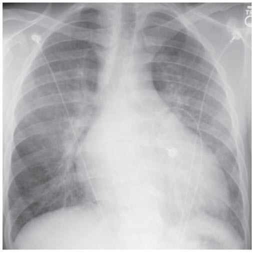 A 59-year-old man presents with complaints of cough and difficulty breathing. Over the last few days, his dyspnea has progressed to the point where he is short of breath unless resting in a seated position. His cough is nonproductive. He has a history of coronary artery disease and alcoholism. On examination, the patient appears uncomfortable; he is afebrile with a blood pressure of 123/72 mmHg, heart rate of 92 beats per minute, and respiratory rate of 24 breaths per minute. He is obese with a BMI of 36 kg/m2 . His heart sounds are distant and he has pitting edema of his lower extremities. A bedside ultrasound is of poor quality given the patient’s body habitus; however, the inferior vena cava (IVC) is enlarged and the width does not change during the respiratory cycle. A serum ethanol level is negative. His other laboratory tests and chest x-ray (Figure below) are shown below: