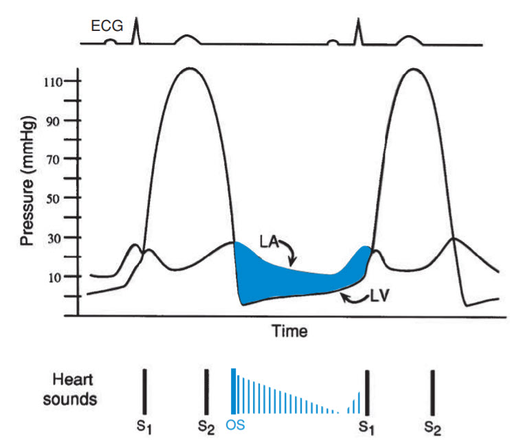 : Increased left atrial pressure. Lupus can cause inflammation of the mitral valve, which can progress to mitral stenosis. Rheumatic heart disease is another cause of mitral stenosis and is a result of repetitive exposure to group A strep. This patient is now presenting in heart failure from decompensated mitral stenosis, which should have been diagnosed based on the murmur heard during cardiac examination. In mitral stenosis, there is an obstruction between the left ventricle and the left atrium so that filling of the ventricle during diastole is incomplete. As a result, pressure increases in the left atrium and causes it to become enlarged, which predisposes the patient to atrial fibrillation. The opening snap is an abnormal sound during early diastole that is caused by the thickened mitral valve leaflets opening. Valves only open when there is a change in pressure between two compartments; therefore, the mitral valve will open when the left atrial pressure exceeds left ventricular pressure during diastole (Figure below). The higher the left atrial pressure, the earlier the opening snap. Hence the mnemonic “tight is tight,” meaning that the more stenotic the valve is (“tight”), the closer the opening snap is to S2 (“tight”). This indicates advanced disease and is a concerning sign. (A, B) Pressure difference between two chambers is the driving force for valve opening/ closure, not volume difference. (C) Increased left ventricular pressure would delay the opening of the mitral valve, which is heard as the opening snap.