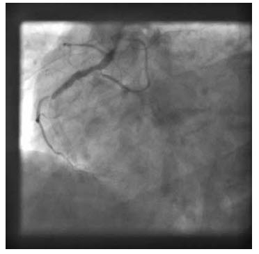 A 45-year-old diabetic man is admitted directly to the catheterization laboratory with chest pain and ST elevation. He had elective angioplasty a week previously for stable angina. He received drug-eluting stents and is taking aspirin and clopidogrel. The relevant angiographic image is shown
