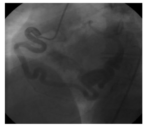 Arteriovenous fistula. The coronary angiography reveals large coronary AV fistula involving the RCA. Patient underwent surgical ligation of the fistula with resolution of her symptoms.