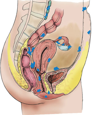 أنسجة بطانة الرحم المُنتبذة في مرض الأندوميتريوسيس يُمكن أن تصل لأعلي البطن أو حتى الرئتين (و لكن نادراً). و أغلبها يكون في الحوض و الصورة التالية تُبين المواضع الشائعة التي تصل إليها بطانة الرحم المُنتبذة (اللون الأزرق) و أكثرها المبيضين