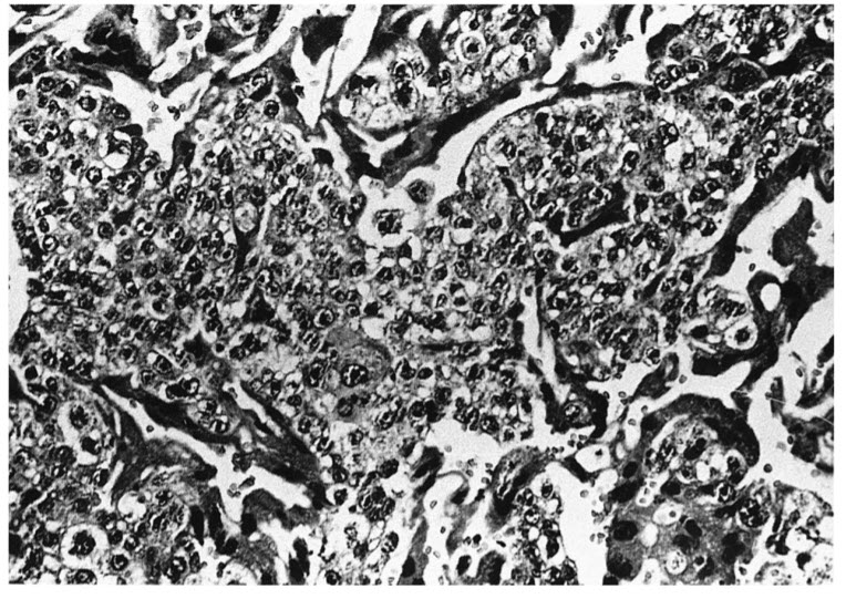 The figure is an example of choriocarcinoma, showing sheets of malignant trophoblasts. Malignant choriocarcinoma is a transformation of molar tissue or a de novo lesion arising from the placenta. There are significant degrees of cellular pleomorphism and anaplasia. Choriocarcinoma can be differentiated from invasive mole by the fact that the latter has chorionic villi and the former does not.