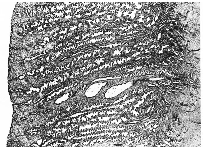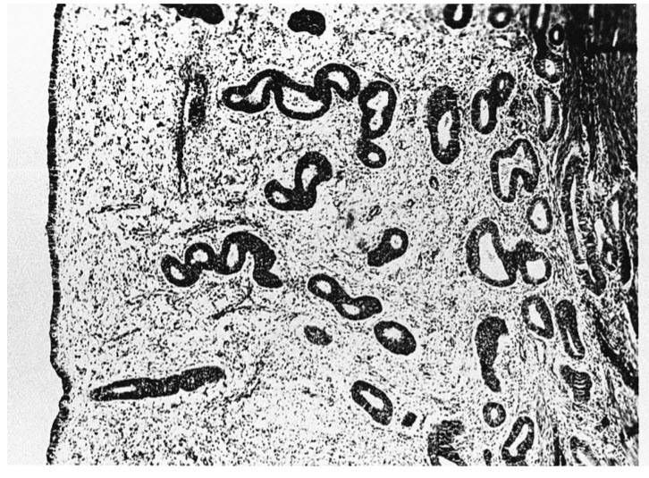 The figure shows early to midproliferative endometrium. Proliferative and late secretory endometrium can be differentiated by the development of glandular tissue and secretory patterns. The glands are just beginning to proliferate, and the section cuts through several coils as they course toward the surface epithelium on the left.