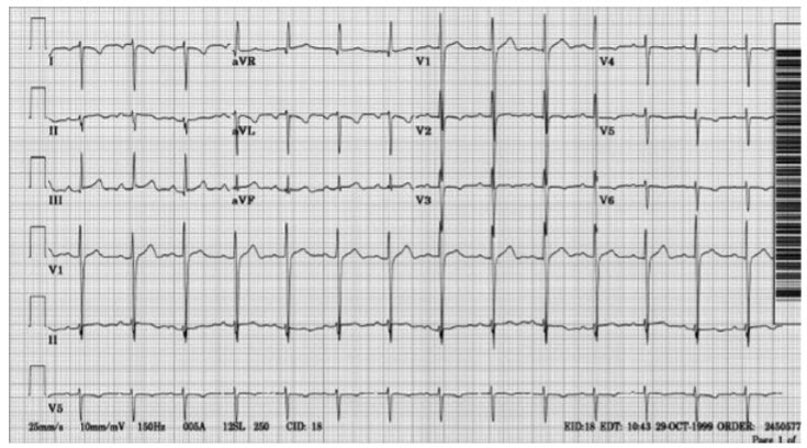 Atrial Septal Defect, primum. This patient has a sinus rhythm. Lead II does suggest left atrial enlargement with a P wave that is broad and notched. There is an rSR′ pattern in lead V1 with T-wave inversion and R′ greater than S. This type of pattern is commonly seen in volume-overload-type RVH. Volume-overload RVH and left axis should suggest ostium primum ASD. Usually an ASD will not affect P waves greatly, at least in the early phases of the process. Ostium primum ASDs, however, very often have mitral valve and notable mitral insufficiency plus left atrial enlargement.