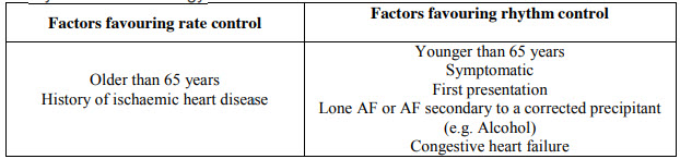 The table below indicates some of the factors which may be considered when considering either a rate control or rhythm control strategy: