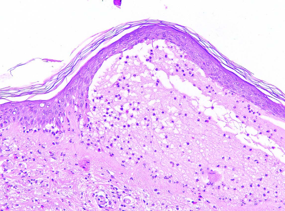 Histopathology of bullous pemphigoid. Lesional skin biopsy with subepidermal splitting and a dense inflammatory infiltrate of eosinophils and neutrophils in the upper dermis.