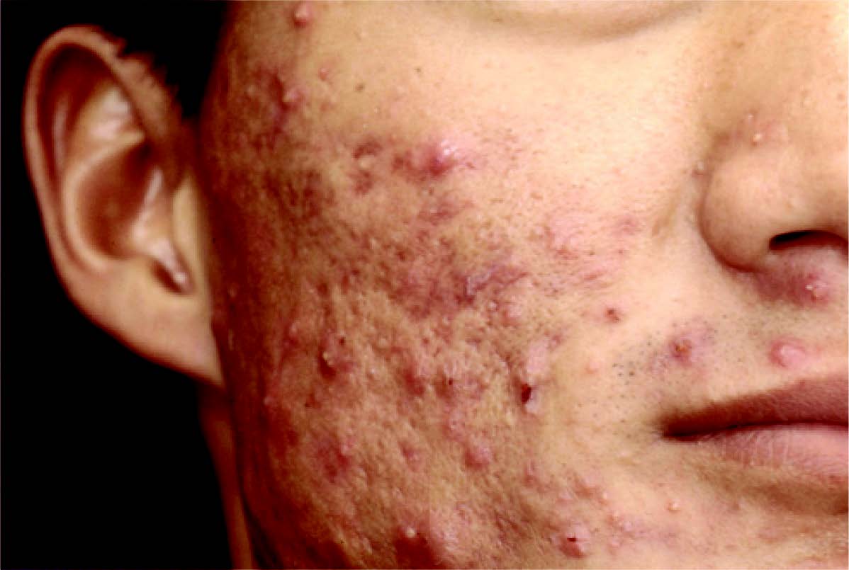 A 15-year-old male returns to the dermatology clinic for review. He has a past history of acne and is currently treated with oral lymecycline. There has been no response to treatment and examination reveals evidence of scarring on his face.