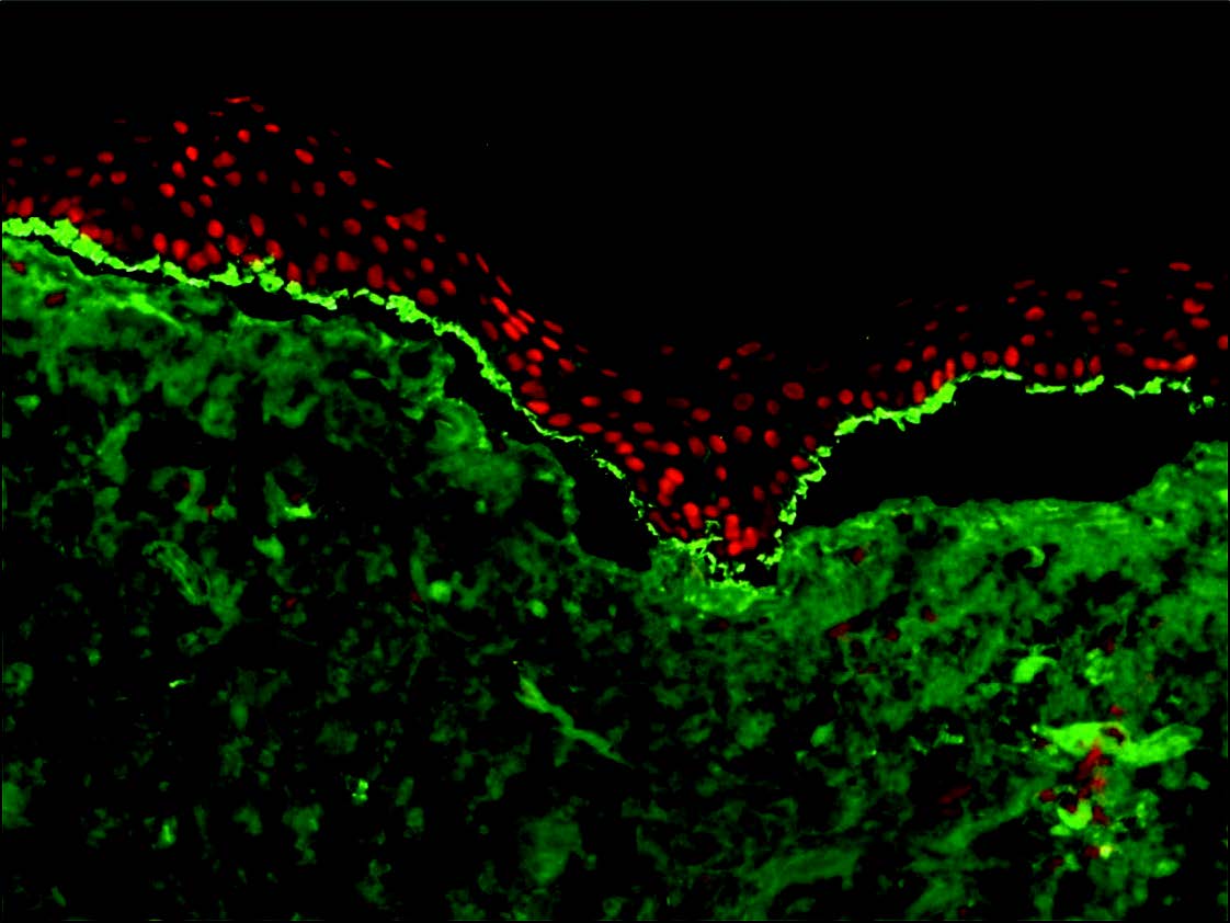 Direct immunofluorescence of bullous pemphigoid showing linear basement membrane zone deposition of IgG.