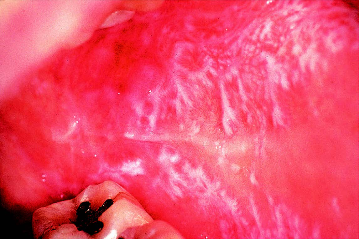 Lichen planus: reticulo-papular lesions in the common oral site, the buccal mucosa.
