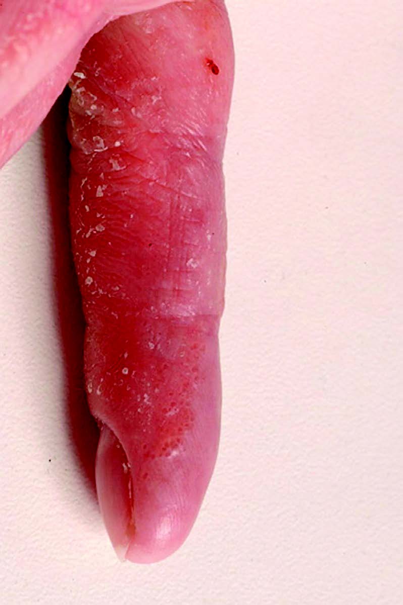 Pompholyx eczema. (a) Small vesicles coalescing into blisters on the lateral aspect of a finger.